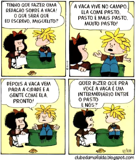 A respeito da cadeia alimentar descrita por Miguelito a Mafalda, pode-se afirmar que:
