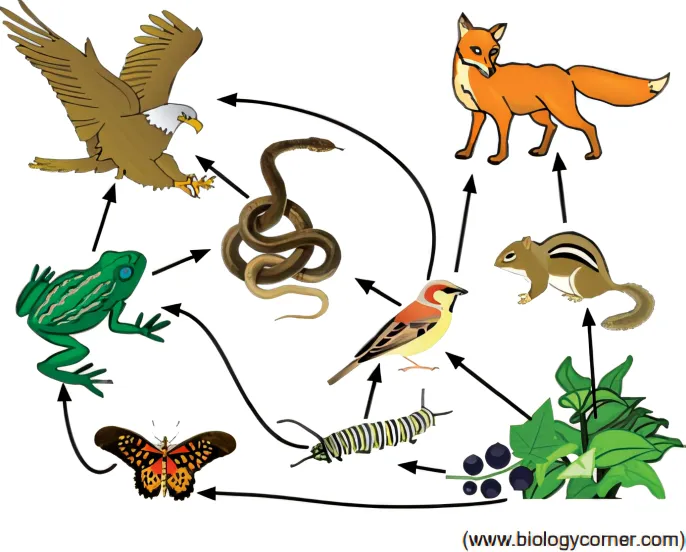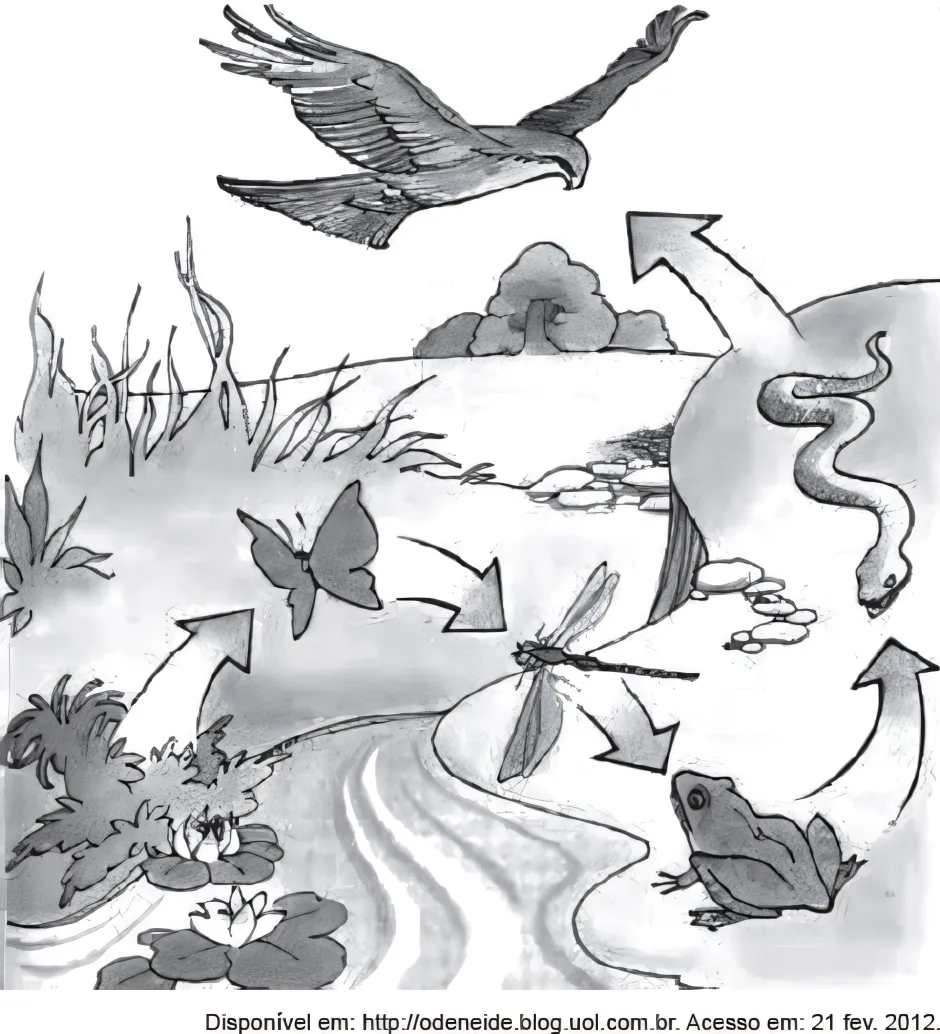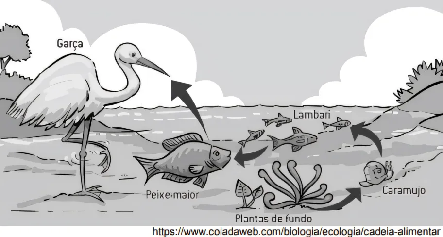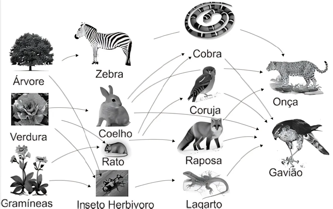 BiologiaFPS2018A teia alimentar é um conjunto de cadeias alimentares interligadas entre si, que forma uma complexa rede de transferência de matéria orgânica e energia. Analise o esquema abaixo.
