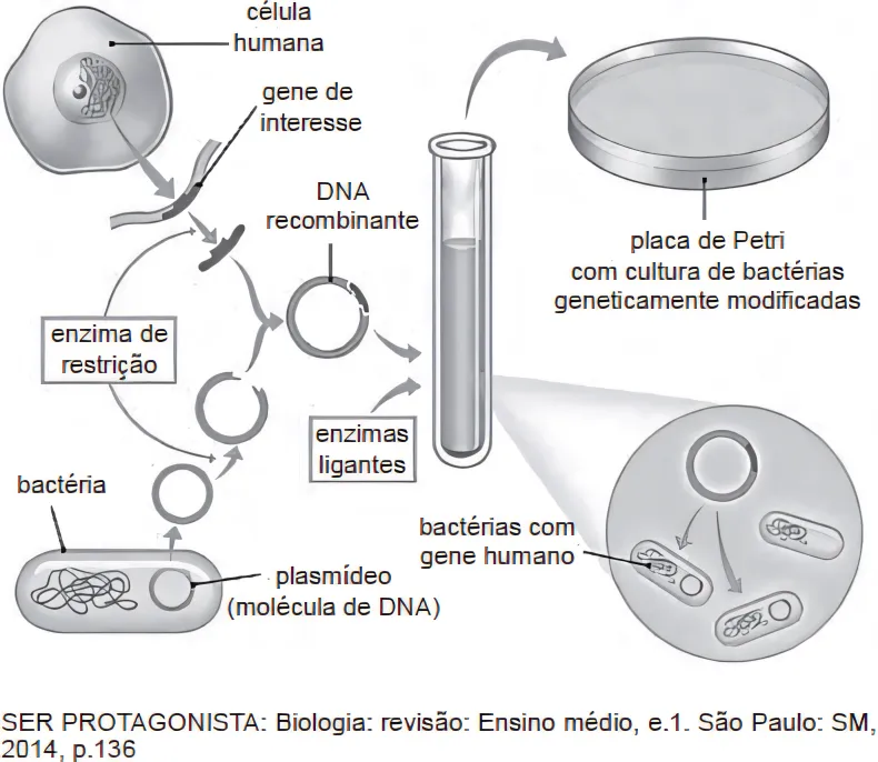 BiologiaCESMAC2020A engenharia genética consiste em um conjunto de técnicas que permitem isolar e multiplicar ácidos nucleicos e também transferi-los de um indivíduo para outro, mesmo entre diferentes espécies. O esquema abaixo ilustra um experimento envolvendo engenharia genética.