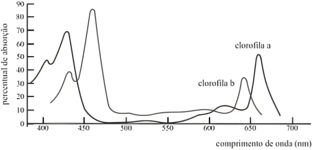 O gráfico a seguir mostra como as clorofilas a e b são estimuladas pela energia luminosa.