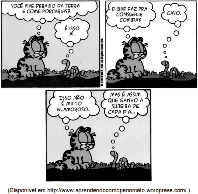 BiologiaUNICAMP2019Nos quadrinhos a seguir, o personagem Garfield questiona a relevância ecológica do animal representado à direita.