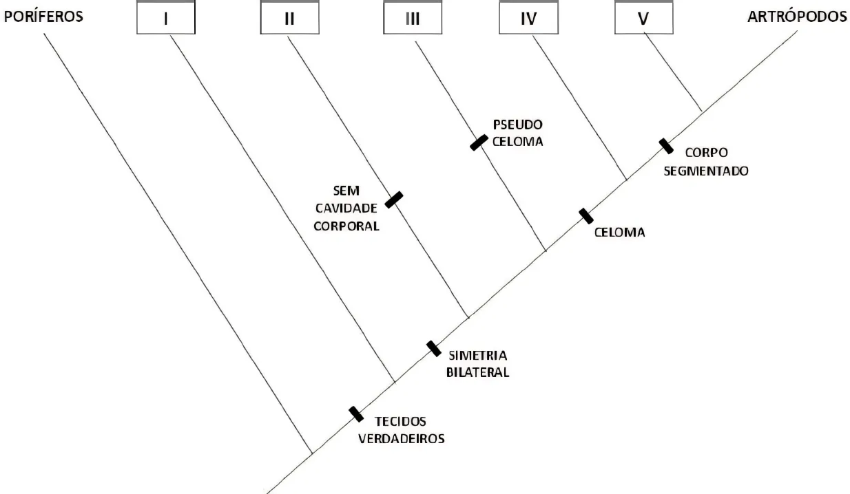 BiologiaSLMANDIC2018A figura estabelece a relação filogenética dos grandes grupos de invertebrados. No esquema, estão indicados dois terminais: poríferos e artrópodos. As “novidades evolutivas” ou caracteres derivados são mostrados nos ramos do cladograma.