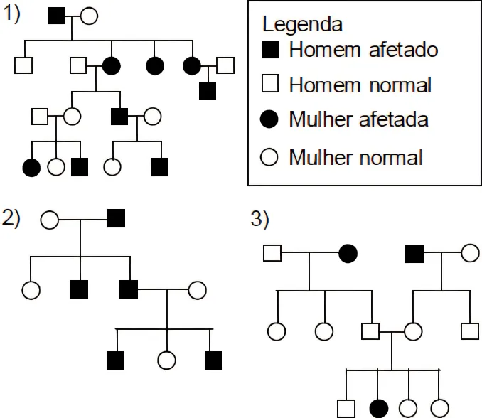 BiologiaFMO2017Analisando as três figuras abaixo, que representam genealogias de diferentes doenças genéticas que seguem padrões de herança mendelianos, é correto afirmar que: