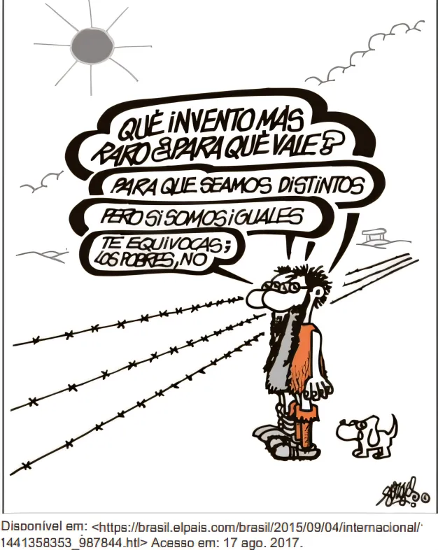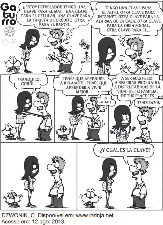 EspanholENEM2019A palavra clave, repetida diversas vezes na tirinha de Gaturro, leva o leitor a uma reflexão sobre o(a)