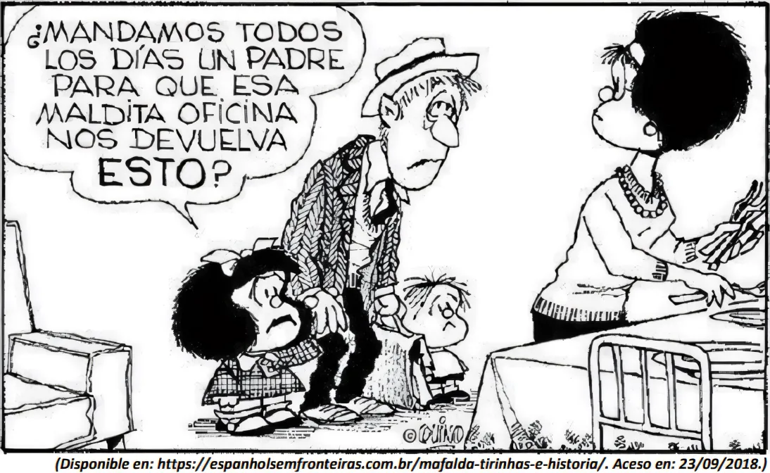 Nas afirmações a respeito do texto “Radiografía de América”, assinale (V) para as verdadeiras e (F) para as falsas. ( ) Nos dois balões, o pronome “le” tem o mesmo referente no discurso. ( ) As palavras “quitado” e “dejado” são sinônimas nesse contexto. ( ) O conector “pero”, nesse contexto, não perde seu caráter adversativo. A alternativa que completa, corretamente, de cima para baixo os parênteses é