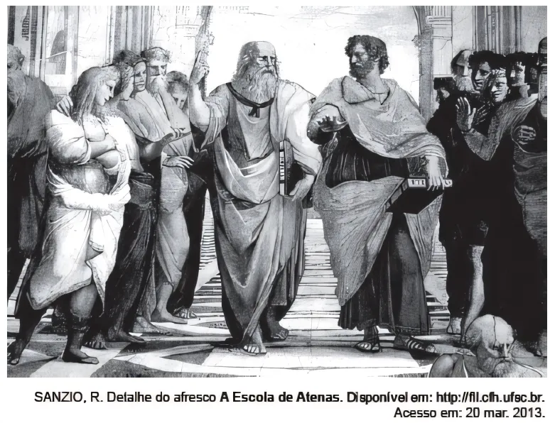 FilosofiaENEM2014No centro da imagem, o filósofo Platão é retratado apontando para o alto. Esse gesto significa que o conhecimento se encontra em uma instância na qual o homem descobre a