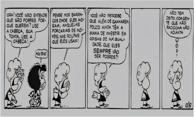FilosofiaPUC-PR2014Atento a tirinha da personagem Mafalda do pensador e quadrinista Joaquín Salvador Lavado Tejón, mais conhecido como Quino, assinale a alternativa que apresenta melhor correspondência entre o pensamento de Jean-Jacques Rousseau sobre a questão da desigualdade social e a tirinha em questão.