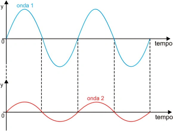 FísicaCUSC2021Duas ondas senoidais, 1 e 2, propagam-se por duas cordas idênticas com velocidades iguais e constantes. Na figura estão representadas, em função do tempo, as coordenadas verticais (y) de dois pontos, um de cada corda, em uma mesma escala.