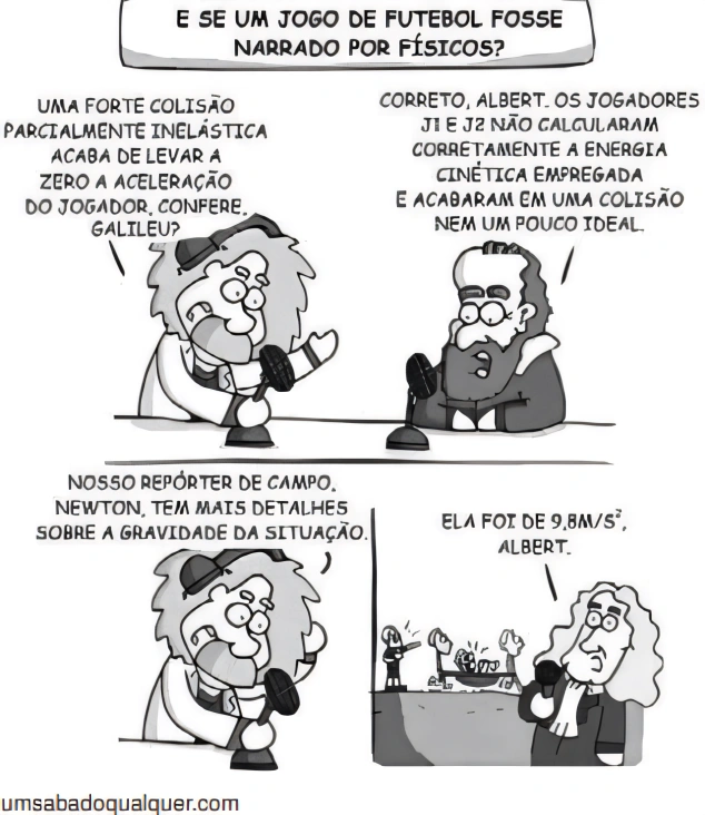 FísicaUEL2019Na Copa do Mundo de 2018, observou-se que, para a maioria dos torcedores, um dos fatores que encantou foi o jogo bem jogado, ao passo que o desencanto ficou por conta de partidas com colisões violentas. Muitas dessas colisões travavam as jogadas e, não raramente, causavam lesões nos atletas. A charge a seguir ilustra a narração de um suposto jogo da Copa, feita por físicos: