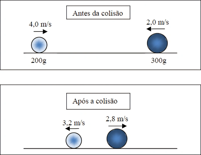 FísicaUnirG2019Em uma colisão unidimensional entre dois objetos sobre uma superfície sem atrito, um de massa 200 g e outro de 300 g, ocorre a inversão dos sentidos de seus movimentos, conforme ilustrado a seguir.