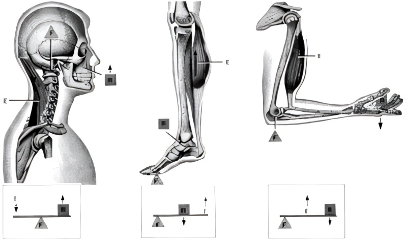 FísicaEMESCAM2016O estudo de forças, equilíbrio e momentos da força é importante na biomecânica do corpo humano. Nas figuras abaixo temos três exemplos de alavancas sendo F a força de sustentação do ponto de apoio, R a resistência ou peso a ser sustentado e E a força muscular aplicada para sustentar a resistência. Na parte debaixo das figuras temos os análogos mecânicos dessas alavancas. A resistência R é representada pelo cubo e a força do ponto de apoio F é representada pelo triângulo.