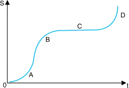 FísicaFGV-SP2017O gráfico horário da posição (S), em função do tempo (t), descreve, qualitativamente, o deslocamento de um veículo sobre uma trajetória. As curvas, nos trechos A, B e D, são arcos de parábola cujos vértices estão presentes no gráfico