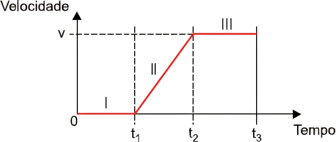 Ao analisar o gráfico, percebemos que o movimento desse carro pode ser fracionado em três situações distintas: I, II e III. Sendo MRU a abreviação para movimento retilíneo e uniforme e MRUV a abreviação para movimento retilíneo uniformemente variado, as situações I, II e III, nesta ordem, correspondem a