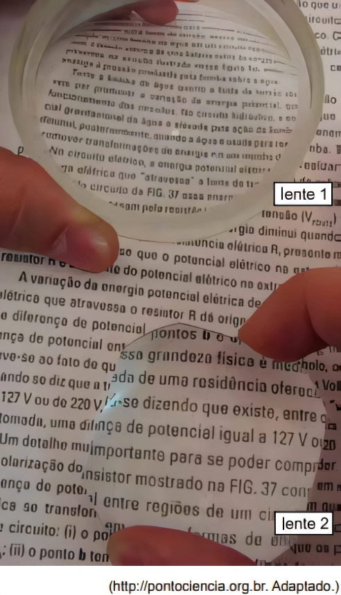 FísicaFAMERP2016Na figura, um texto é visto através de duas lentes esféricas, 1 e 2. A imagem formada pela lente 1 aparece menor do que o próprio texto e a imagem formada pela lente 2 aparece maior.