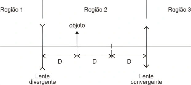 As lentes distam 3D uma da outra e estão dispostas de modo que seus eixos principais sejam coincidentes. Entre elas, e sobre o eixo principal das lentes, encontra-se um objeto luminoso que dista D da lente divergente e 2D da lente convergente.