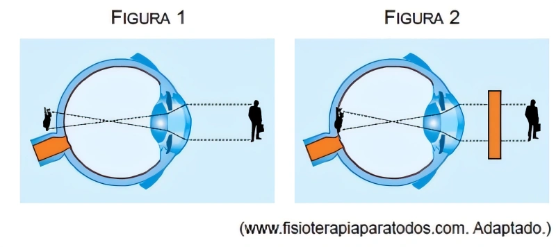FísicaUNICID2016A figura 1 mostra, esquematicamente, um olho humano no qual a imagem se forma após a retina. Na figura 2 está representada a correção dessa anomalia, com o uso de uma lente.