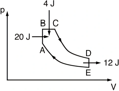 FísicaUPE2018A figura ilustra os diversos processos termodinâmicos a que um gás é submetido em uma máquina térmica. Os processos AB e DE são isocóricos, EA e CD são adiabáticos, e o processo BC é isobárico. Sabendo que a substância de trabalho dessa máquina é um gás ideal, determine a sua eficiência.