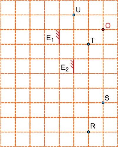 Considerando as leis da reflexão, as imagens dos pontos observadas por essa pessoa nos espelhos E1 e E2 são, respectivamente,