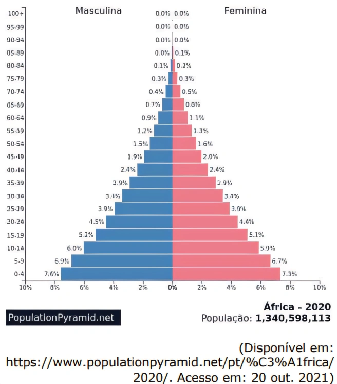 GeografiaUnirG2018A estrutura etária de uma população e suas variações no tempo, podem ser representadas por meio de pirâmides. Estas consistem em gráficos de barras que representam a distribuição de indivíduos com base na idade e no sexo.