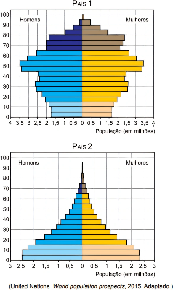 GeografiaUEA2016As pirâmides etárias expressam o número de habitantes de um país, distribuídos de acordo com o sexo e a idade. Analise as pirâmides etárias dos países 1 e 2.