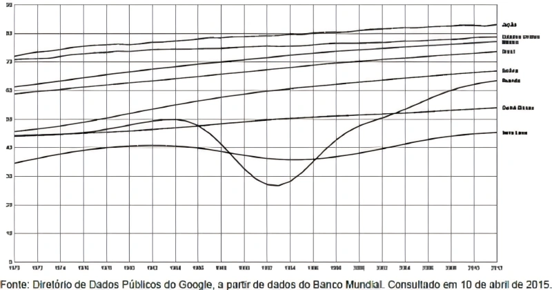 GeografiaFPP2016Sobre o indicador da expectativa de vida de um país ou região, observe e analise o gráfico a seguir: