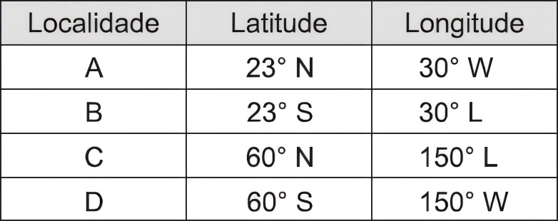 GeografiaUNEB2017Com base na análise tabela e nos conhecimentos sobre coordenadas geográficas, é correto afirmar: