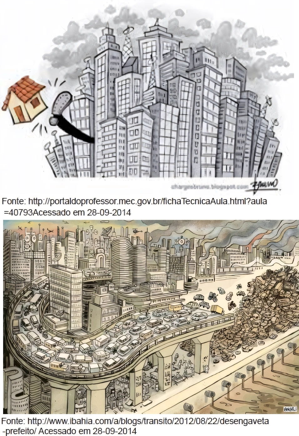 GeografiaSLMANDIC2015Ambas as charges retratam, com ironia, problemas que afligem a população das grandes cidades, ocasionados pelo crescimento desordenado e falta de planejamento. Os artistas retrataram, respectivamente, os seguintes problemas: