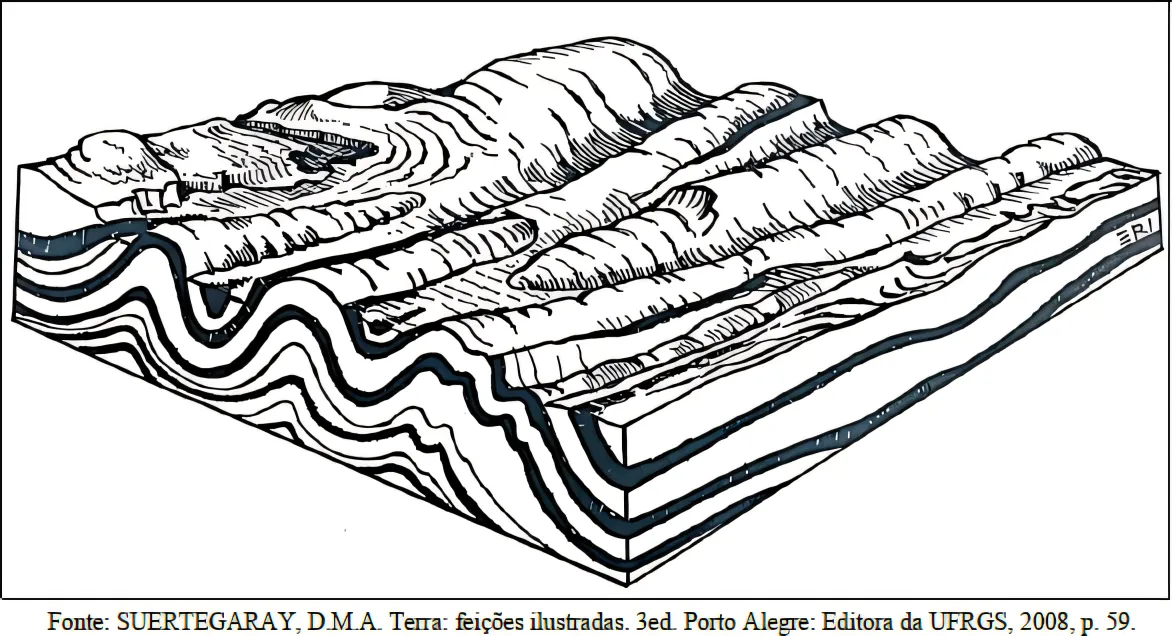 GeografiaUECE2019Leia atentamente o seguinte excerto: “É um relevo estrutural esculpido em antigas formações dobradas, exumadas pela denudação. Esse relevo caracteriza-se por um alinhamento paralelo de cristas e vales. As cristas formadas nos estratos mais resistentes e os vales formados nos menos resistentes. [...] Caracteriza-se por ser um relevo bifásico ou polifásico, constituindo-se por dobramento, soerguimento, aplainamento e novo soerguimento”.