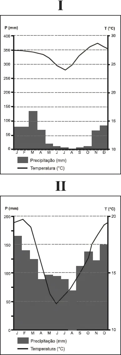 GeografiaUESB2015A análise dos climogramas I e II e os conhecimentos sobre os tipos climáticos do Brasil permitem afirmar que eles representam, respectivamente, os climas