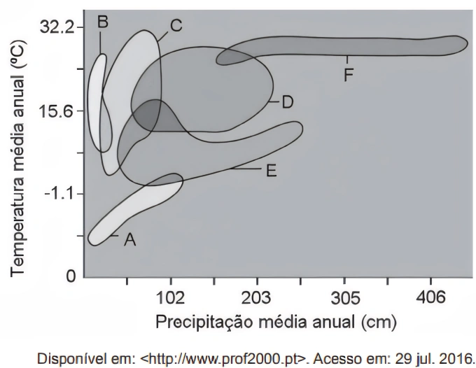 Identifica-se os biomas A, B e F, respectivamente, como: