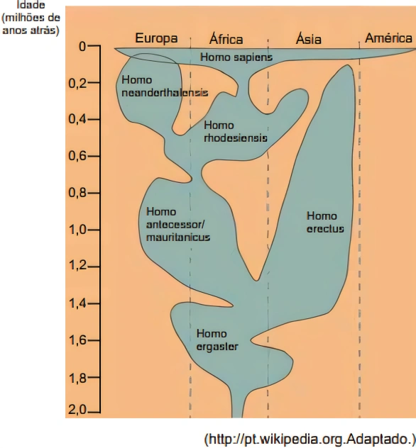 HistóriaUEA2014O diagrama ilustra uma das teorias sobre a evolução e distribuição dos hominídeos nos últimos dois milhões de anos.
