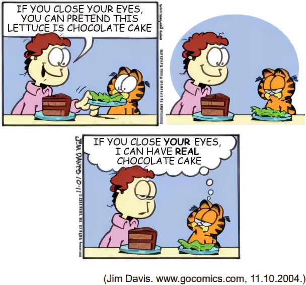 No contexto da tirinha, o pensamento do gato indica que ele