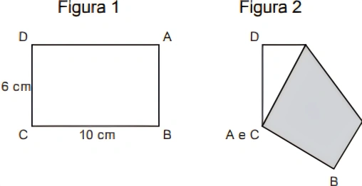 MatemáticaPUC-Campinas2017Os lados de uma folha retangular ABCD de papel medem 10 cm e 6 cm, como indica a Figura 1. Essa folha, que é branca de um dos lados e cinza do outro, será dobrada perfeitamente de tal forma que o vértice A irá coincidir com o vértice C, como mostra a Figura 2.