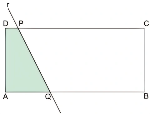 MatemáticaFAMERP2016Uma reta r divide um retângulo ABCD em dois trapézios, de tal forma que a área do trapézio ADPQ é a quarta parte da área desse retângulo.