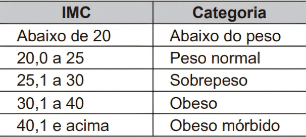 MatemáticaENCCEJA2017A obesidade é um dos maiores fatores de risco para doenças e, para evitá-la, é importante conhecer as categorias de peso, que podem ser identificadas através do Índice de Massa Corpórea (IMC). O IMC é a razão entre a massa de uma pessoa (em quilograma) e o quadradode sua altura (em metro), ou seja IMC = Massa/(Altura)2. As categorias para os resultados do IMC são mostradas na tabela.