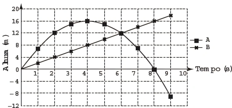 MatemáticaENEM2016Para uma feira de ciências, dois projéteis de foguetes, A e B, estão sendo construídos para serem lançados. O planejamento é que eles sejam lançados juntos, com o objetivo de o projétil B interceptar o A quando esse alcançar sua altura máxima. Para que isso aconteça, um dos projéteis descreverá uma trajetória parabólica, enquanto o outro irá descrever uma trajetória supostamente retilínia. O gráfico mostra as alturas alcançadas por esses projéteis em função do tempo, nas simulações realizadas.