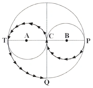 MatemáticaUNIFOR2015A figura abaixo mostra três circunferências de centros A , B e C e tangentes duas a duas. Se as retas que liga os pontos C a Q e P a T são perpendiculares e se o raio da circunferência maior é 6m, quantos metros deve uma pessoa percorrer para ir do ponto P ao ponto Q seguindo a trajetória dada pela figura?