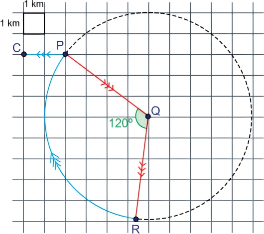 MatemáticaFACISB2020A figura indica o percurso do treino de corrida de um atleta de longa distância. A corrida começa no ponto P, depois o atleta segue, em linha reta, até Q e, de lá, também em linha reta, vai até R. Os trechos PQe QR têm o mesmo comprimento. No trecho de volta, o atleta corre sobre um arco RP de circunferência de centro Q e ângulo central PQR de medida igual a 120º, chegando novamente ao ponto P e, de lá, segue em linha reta até o ponto C, local onde conclui seu treino.