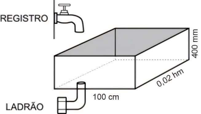 Abre-se um registro com capacidade de 100 cL/min para encher a caixa d’água. Quando ela está cheia, abre-se um ladrão com capacidade de esvaziá-la a 0,04 hL/min e fechase simultaneamente o registro.