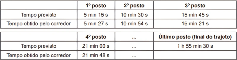 MatemáticaENEM2019Em uma corrida de regularidade, cada corredor recebe um mapa com o trajeto a ser seguido e uma tabela indicando intervalos de tempo e distâncias entre postos de averiguação. O objetivo dos competidores é passar por cada um dos postos de averiguação o mais próximo possível do tempo estabelecido na tabela. Suponha que o tempo previsto para percorrer a distância entre dois postos de verificação consecutivos seja sempre de 5 min 15 s, e que um corredor obteve os seguintes tempos nos quatro primeiros postos.