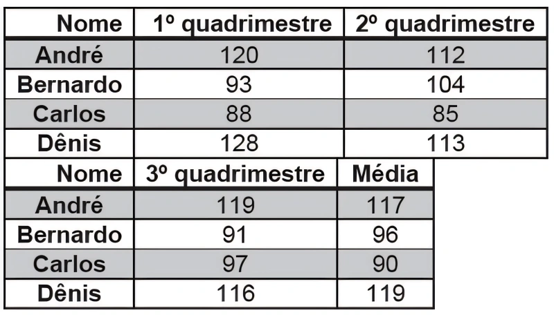 MatemáticaUPE2015Em 2013, a nutricionista de um SPA optou por avaliar e classificar os pacientes André, Bernardo, Carlos e Dênis fazendo pesagens ao final de cada quadrimestre. O resultado das pesagens de cada paciente está apresentado na tabela a seguir (em quilogramas) que contém, também, a média aritmética dos pesos de cada um deles.