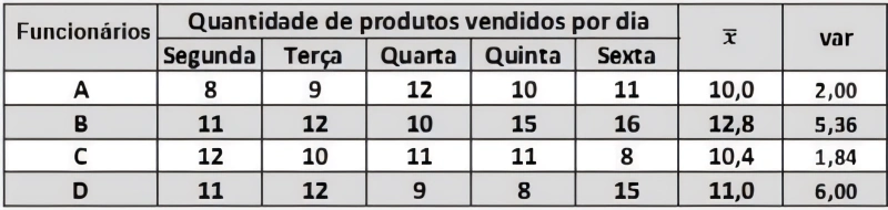 O dono de uma microempresa pretende saber, em média, quantos produtos são vendidos por cada funcionário em um dia. O gerente tem conhecimento que nem todos conseguem vender a mesma quantidade de peças, mas pede que seus funcionários façam um registro de sua produção em uma semana de trabalho. Ao fim desse período, chegou-se à seguinte tabela: