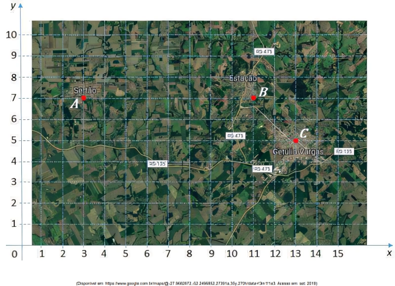 MatemáticaUPF2020Uma empresa de telefonia pretende instalar uma antena que se localize a igual distância de três cidades do interior do estado do RS, representadas pelos pontos A, B e C. Para obter essa localização, reproduziu o mapa em um sistema de referências cartesianas, conforme a figura seguir.