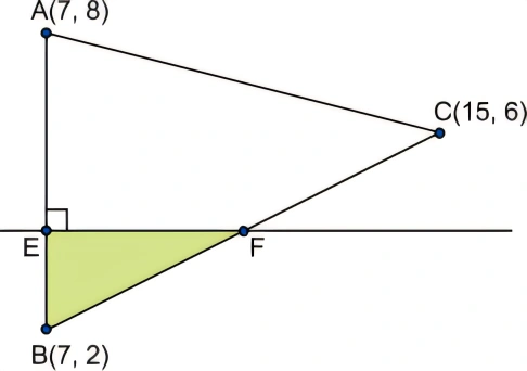 MatemáticaFASM2020Os pontos E e F pertencem aos lados do triângulo de vértices A(7, 8), B(7, 2) e C(15, 6). A reta EF é perpendicular ao lado AB, conforme mostra a figura.