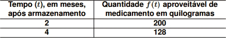 Suponha que um determinado medicamento, em forma de cápsula, seja armazenado com perdas relativas à estocagem e que a quantidade de cápsulas em condições de consumo comece a decair conforme um modelo de função exponencial. A tabela a seguir explicita dois momentos e respectivas quantidades de comprimidos em condições de uso.