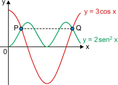 MatemáticaSanta Casa2020Observe o gráfico de duas funções trigonométricas, de em , cujas duas primeiras intersecções positivas estão indicadas pelos pontos P e Q.