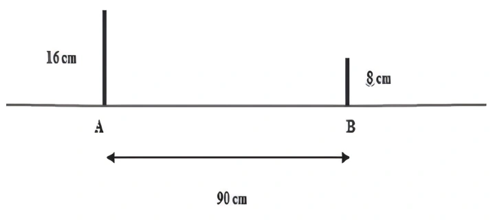MatemáticaUPE2015A distância entre duas varetas fincadas verticalmente num terreno é de 90 cm. Uma delas mede 16 cm, e a outra, 8 cm. Na reta que os contém, existem dois pontos P e Q nos quais uma formiga pode se situar de tal forma que vê as duas varetas com a mesma altura (ilusão de ótica). Isso ocorre quando os ângulos de visão da formiga forem iguais. Qual a distância entre esses pontos?