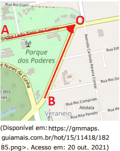 MatemáticaUFMS2021No fragmento do mapa do Parque dos Poderes, os segmentos de reta AOe OB são tais que med(AO) = med(OB) = 800 m, sendo o ângulo AÔB = 60°.