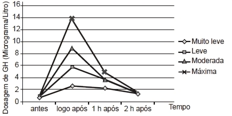 MatemáticaENEM2017GH e a sigla que denomina o hormônio do crescimento (do inglês growth hormone), indispensável para retardar o processo de envelhecimento. A medida que envelhecemos, a liberação desse hormônio na corrente sanguínea vai diminuindo. Estudos têm demonstrado, porém, que alguns métodos de treinamento aumentam a produção de GH. Em uma pesquisa, dez homens foram submetidos a sessões de 30 minutos de corrida, em uma esteira, em diferentes intensidades: muito leve, leve, moderada e máxima. As dosagens de GH, medidas por coletas de sangue feitas antes e logo após as sessões, e também 1 hora e 2 horas após o termino, são fornecidas no gráfico.