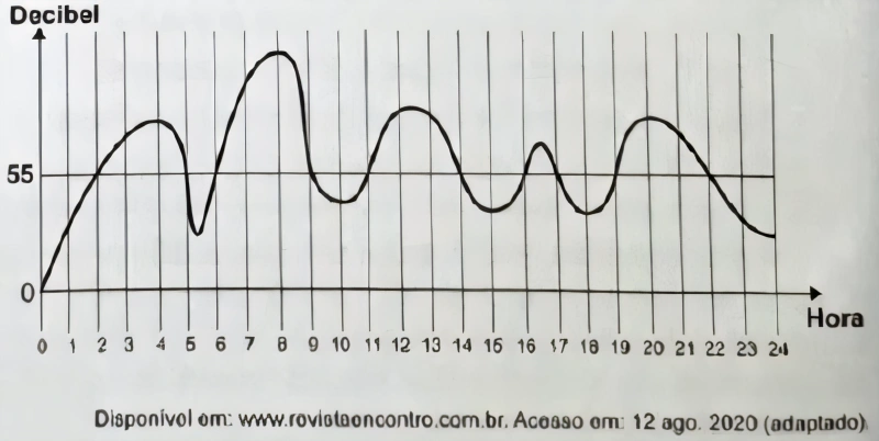 MatemáticaENEM2020A exposição a barulhos excessivos, como os que percebemos em geral em trânsitos intensos, casas. noturnas e espetáculos musicais, podem provocar insônia, estresse, infarto, perda de audição, entre outras enfermidades. De acordo com a Organização Mundial da Saúde, todo e qualquer som que ultrapasse os 55 decibéis (unidade de intensidade do som) já pode ser considerado nocivo para a saúde. O gráfico foi elaborado a partir da medição do ruído produzido, durante um dia, em um canteiro de obras.